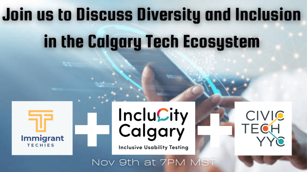 Come and meet Immigrant Techies Alberta and the new inclusive user testing group Inclucity Calgary as we discuss and diversity and inclusion in the local technology ecosystem. Learn about all of the groups and about opportunities to take part in new up-and-coming projects.