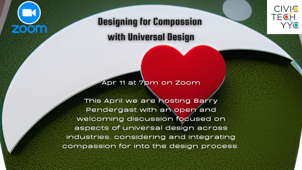This April 11th at 7pm (Mountain) on Zoom for CivicTechYYC we are hosting Barry Pendergast with an open and welcoming discussion focused on aspects of universal design across industries, considering and integrating compassion for into the design process.