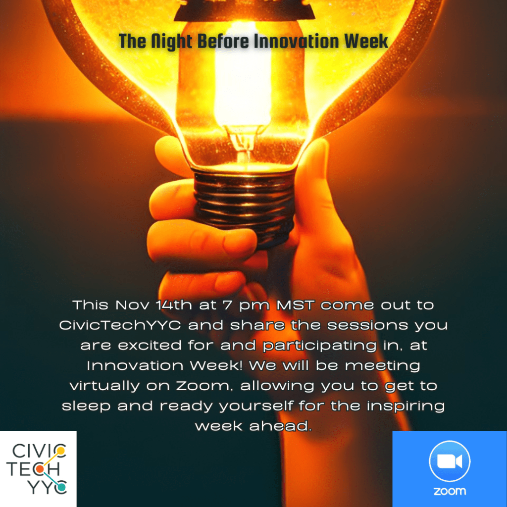 This November 14th at 7 pm MST come out to CivicTechYYC and share the sessions you are excited for attending and participating in at Innovation Week! We will be meeting virtually on Zoom, allowing you to get to sleep and ready yourself for the inspiring week ahead.