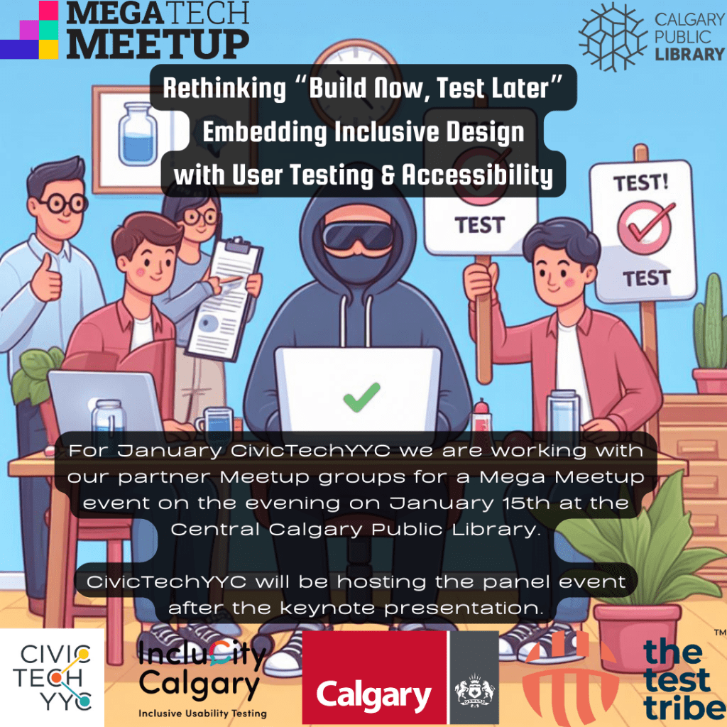 Hosted by Ross Plattel from CivicTechYYC with panellists Uriel Karerwa from IncluCity Calgary, Paula Madeira from the City of Calgary, and Lavanya Mohan and Kate Bazunova from The Test Tribe.