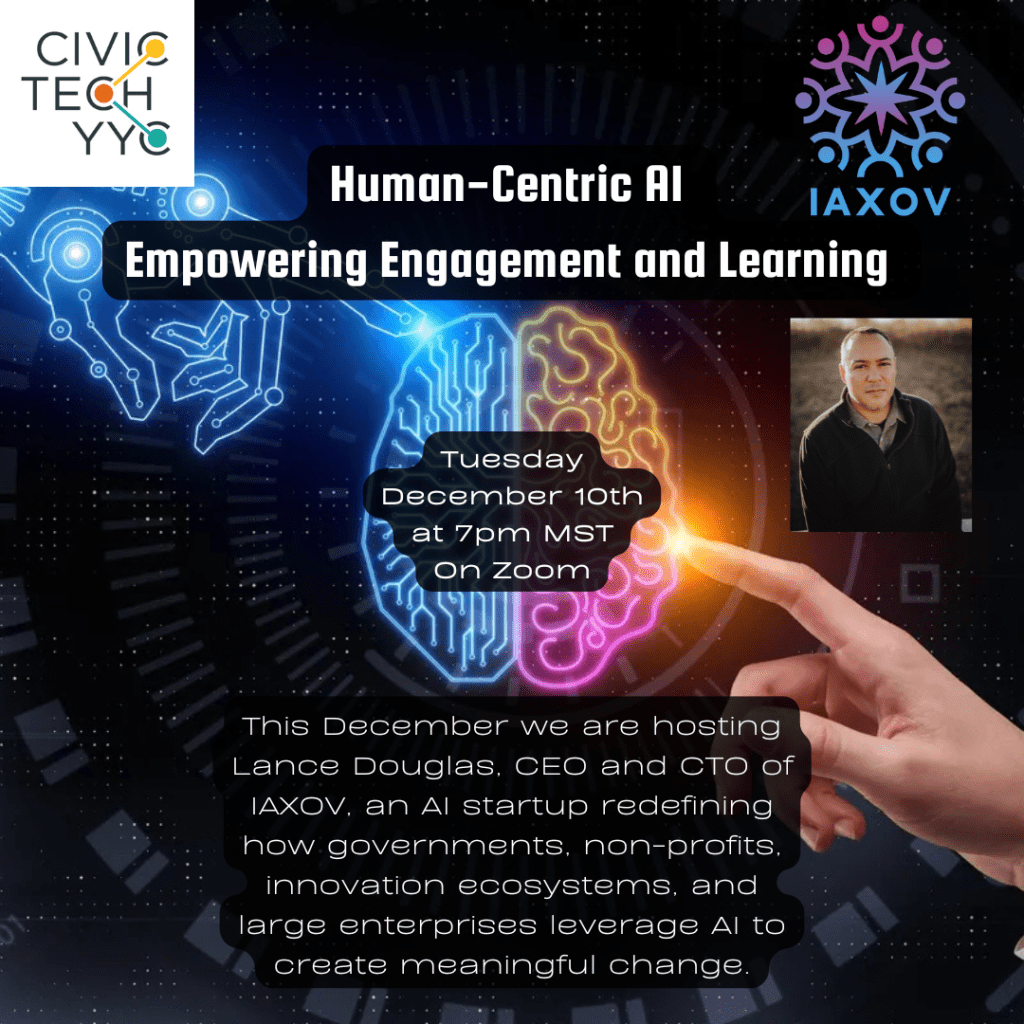 This December 10th at 7pm on Zoom we are hosting Lance Douglas, CEO and CTO of IAXOV, an AI company redefining how governments, non-profits, innovation ecosystems, and large enterprises leverage AI to create meaningful change. Efficiently automating decades of assessment, compliance, and competency development. IAXOV is an advanced AI-powered platform that empowers organizations to capture information with enhanced engagement, providing streamlined and more consistent information gathering, informing decision-making across multiple sectors.